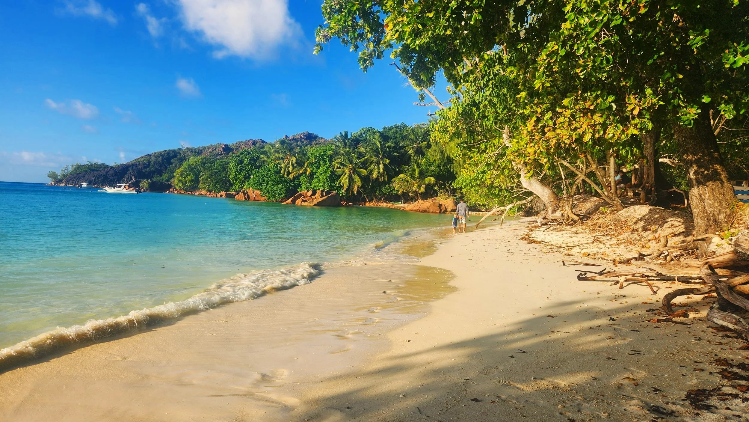 Over the next week, we experienced the most stunning sunsets (and sunrises, thanks to our 1-year-old), swam in crystal-clear waters, played on beaches straight out of holiday magazines, and savored the most delicious Seychellois food. We hiked picturesque paths, visited a national park home to the largest nut in the world, fed huge fish from our boat, petted giant tortoises at a sanctuary, climbed unique round stones found only in the Seychelles, and completely disconnected from the rest of the world. And the weather? Absolutely perfect—sunny blue skies and water temperatures that felt almost unreal.