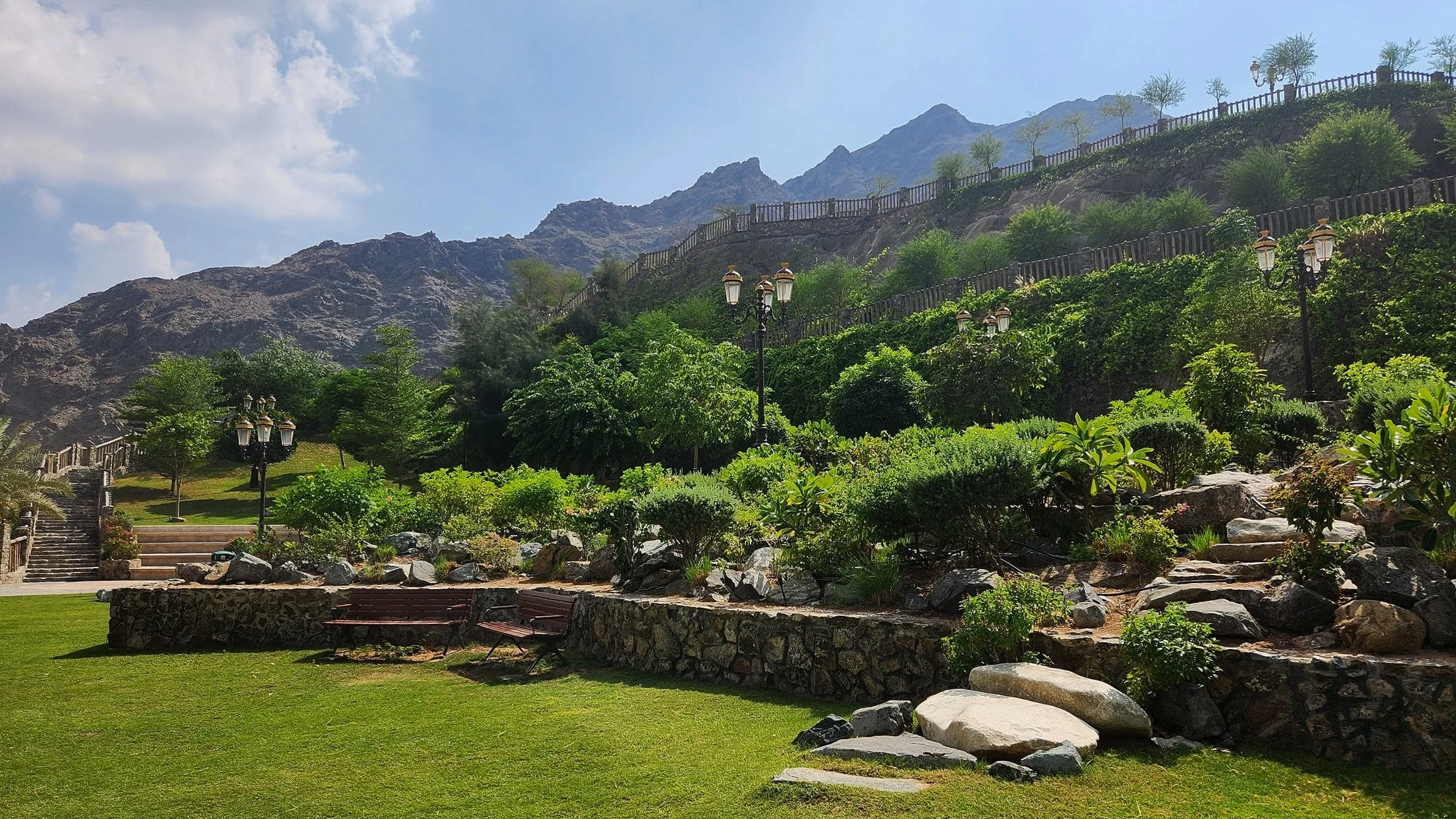 Tucked along the scenic route to Khor Fakkan and Fujairah, Shees Park is a gem in the heart of the mountains. This charming hillside park offers a 5 AED entry for adults, while kids under six can enter for free. Winding pathways lead through lush gardens to a serene, man-made waterfall and cozy rest areas, including a playground. For the best views, climb up the steps to panoramic lookout points that showcase the rugged beauty of the surrounding mountains.
